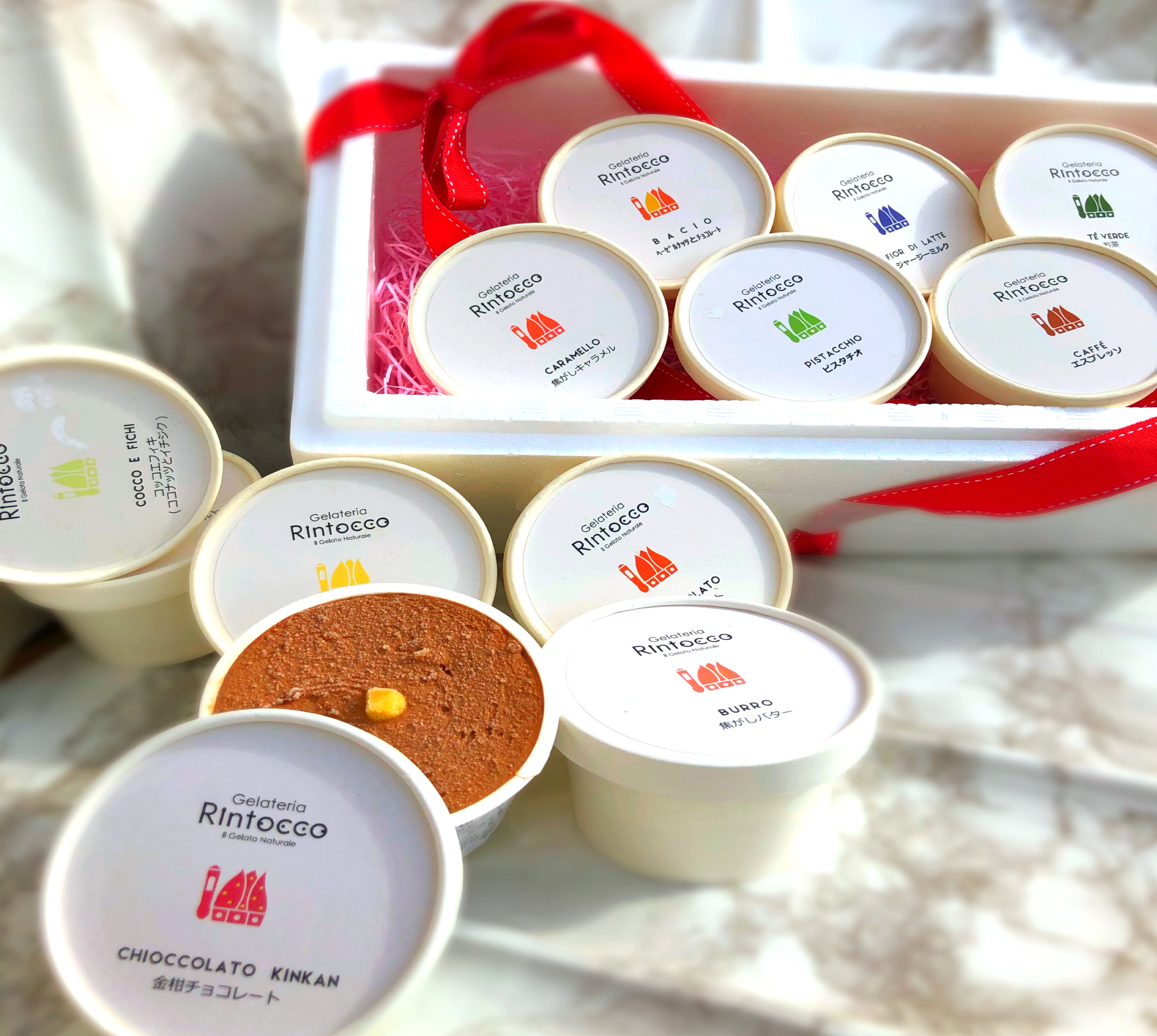 12個セット:ジャージーミルク×2・焦がしキャラメル・ビアンカ・金柑ミルク・ほうじ茶・バーチョ(ヘーゼルナッツチョコレート)・ピスタチオ・キャラメルローズマリー・ストラッチャテッラ(チョコチップ)・レモンヨーグルト・季節のシャーベット