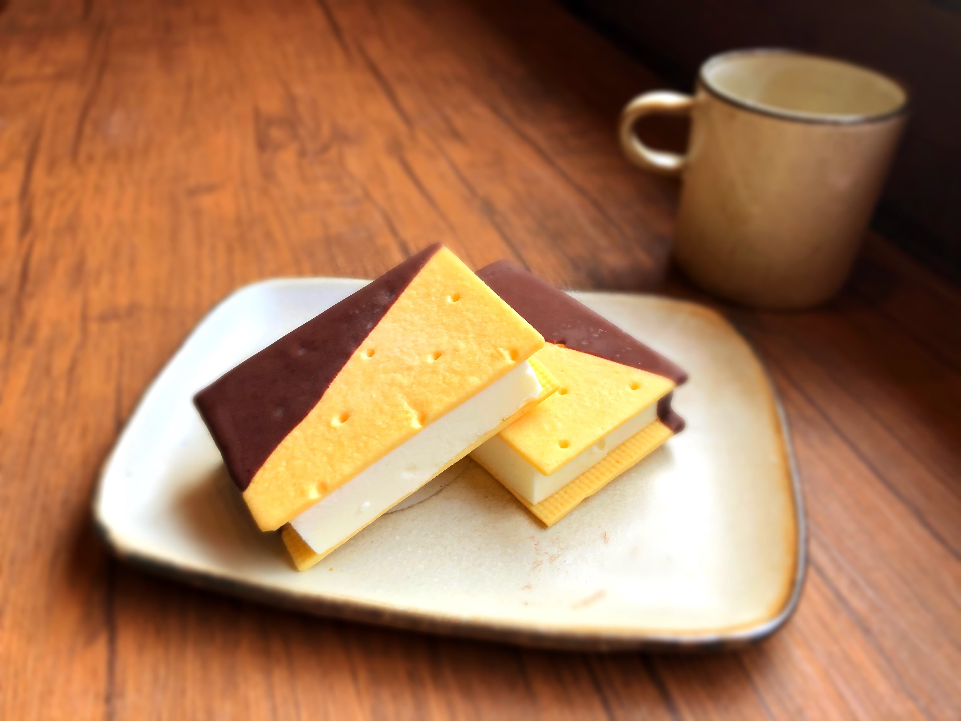 ①定番の人気No.1の濃厚なジャージーミルクジェラートをオーガニック全粒粉を使用した栄養たっぷりサクサクのビスケットでサンドし、ほんのりビターなチョコレートでコーティング。